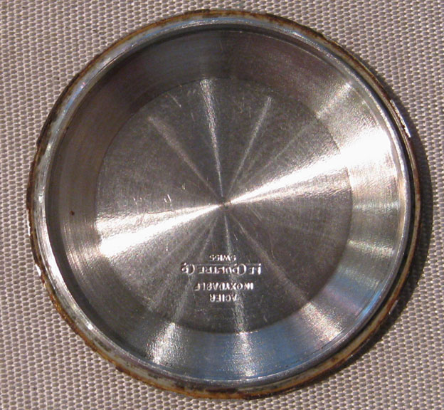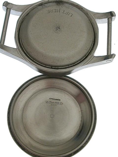 Mark 11s are housed in a stainless steel case (marked "Staybrite on JLCs) with a screwed back.  As James Dowling pointed out, "the Mark 11 can make a claim to be the first wristwatches in the world designed from scratch to be anti magnetic.  Both JLC and IWC feature a very thick iron dial, which is cup shaped and so covers the side of the movement; the movement iron cover is similarly shaped and rises to meet the dial sides. This means that the movement is completely encased in a non magnetic "Faraday cage", thereby providing a high degree of anti magnetic shielding."